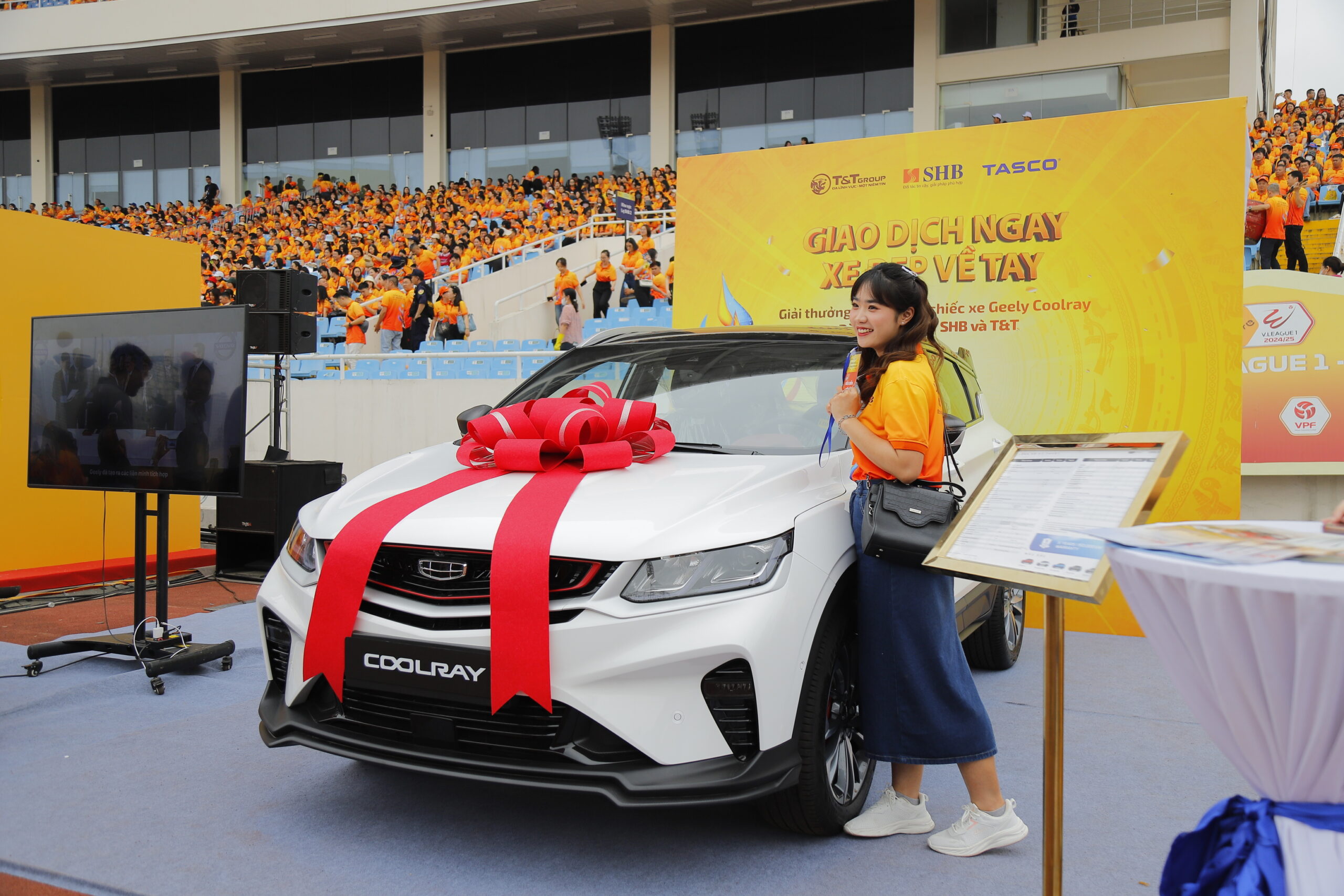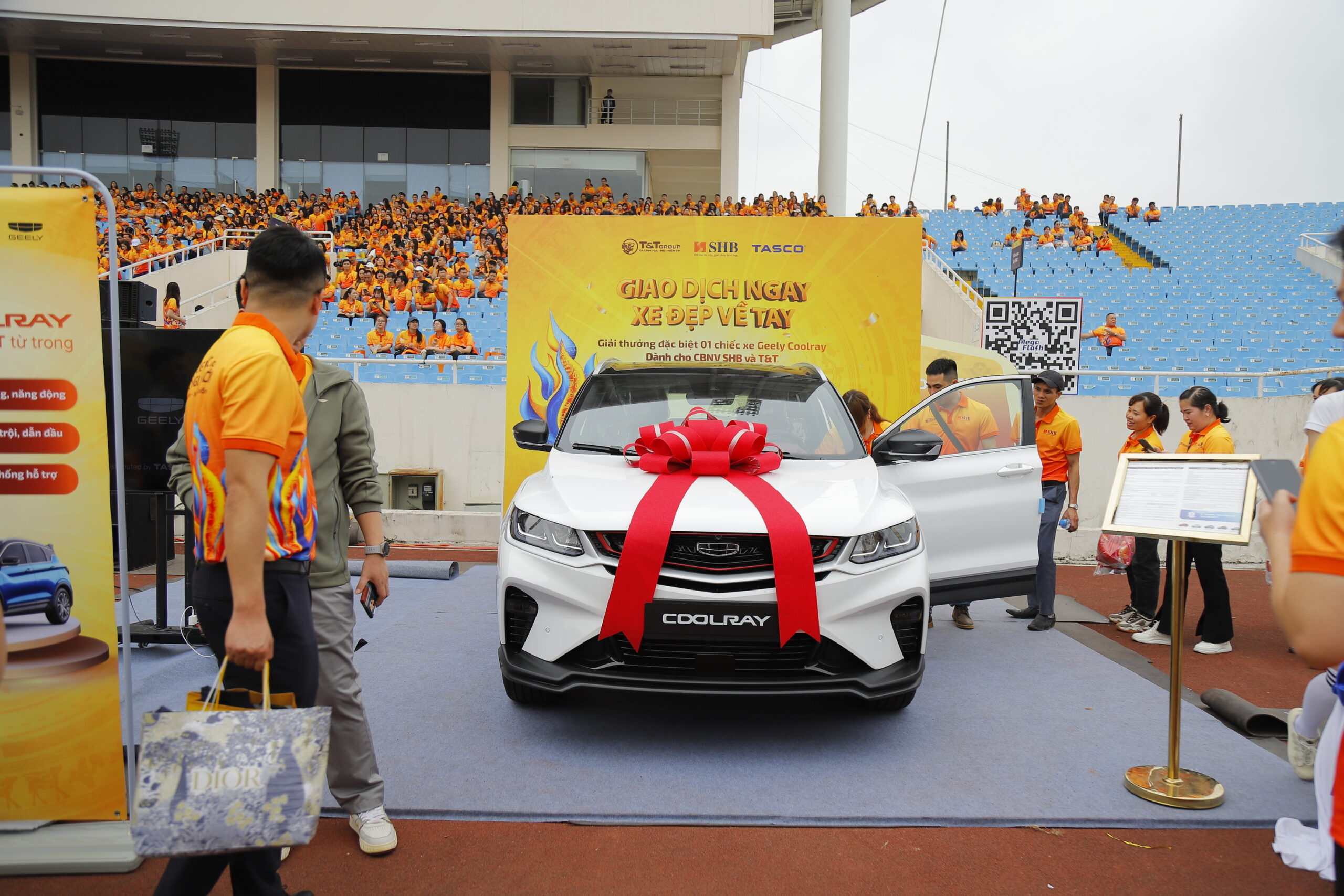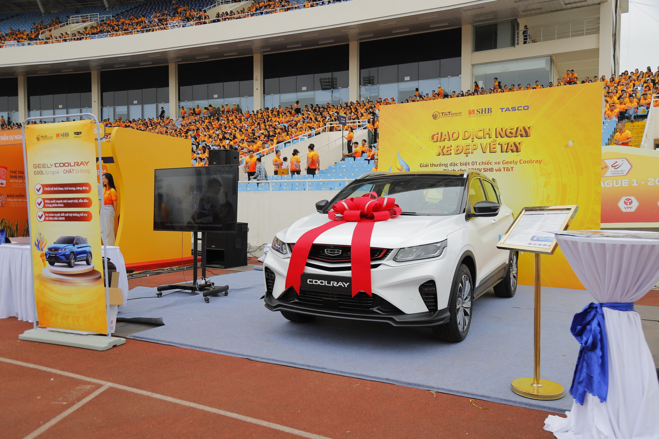 Một trong những điểm nhấn đáng chú ý tại Ngày hội Văn hóa SHB & T&T Group, diễn ra tại SVĐ Mỹ Đình vào ngày 15/03, chính là sự xuất hiện của mẫu xe Geely Coolray. Dù chưa chính thức ra mắt tại thị trường Việt Nam, mẫu SUV này đã trở thành phần thưởng đặc biệt dành cho cán bộ nhân viên may mắn trong chương trình bốc thăm trúng thưởng. Đây là một trong những lần hiếm hoi một mẫu xe chưa ra mắt đã được lựa chọn làm quà tặng tại một sự kiện lớn, cho thấy sự quan tâm đặc biệt của thị trường đối với Geely Coolray.