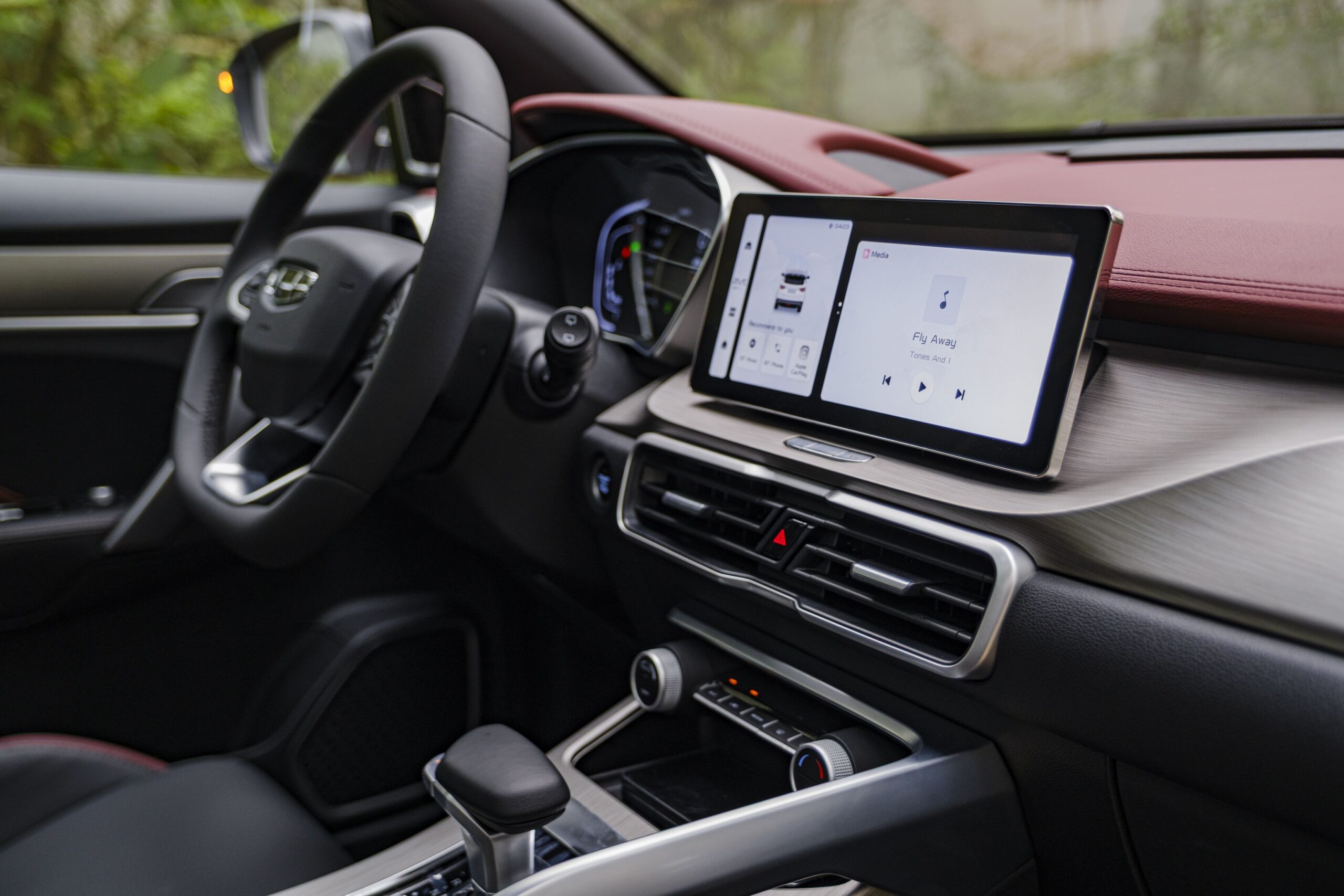 Geely Coolray không chỉ nổi bật với hiệu suất mạnh mẽ mà còn sở hữu một khoang nội thất sang trọng. Xe được trang bị màn hình kép 10.25 inch cho hệ thống giải trí và cụm đồng hồ, vô-lăng D-Cut thể thao, cùng ghế bọc da cao cấp và cửa sổ trời toàn cảnh, mang lại không gian thoải mái và tiện nghi. Ngoài ra, xe cũng hỗ trợ kết nối Apple CarPlay và Android Auto, giúp người lái dễ dàng kết nối và tận hưởng các tiện ích giải trí.